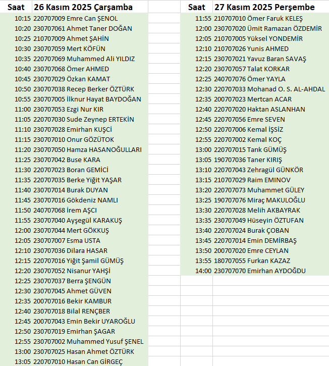 1- 2024/2025 eğitim öğretim yılı yaz döneminde tamamladığınız stajlarınız ile ilgili mülakaat sınavlarınız aşağıdaki tabloda belirtilen tarih ve saatlerde, mühendislik fakültesi binası 1nci katta bulunan Elektrik-Elektronik Mühendisliği bölümü laboratuarında gerçekleştirilecektir. Mülakatlara katılmak zorunludur, stajdan alacağınız notlar mülakat sonunda belirlenecektir.